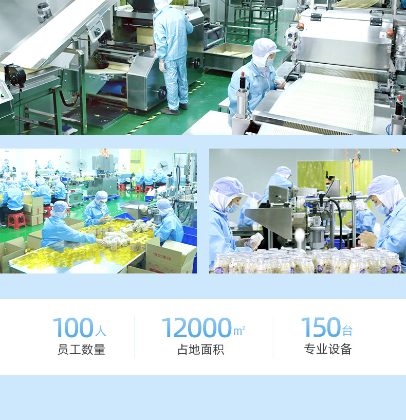 漳州童世界食品有限公司主營一站式代加工OEM業(yè)務(wù),致力于健康兒童食品、功能性代餐食品、凍干燕窩的研發(fā)與生產(chǎn),公司占地面積12000平方米,始終秉承已科技為先導(dǎo)、以先進(jìn)的現(xiàn)代化管理依托、已“顧客滿意第一”為宗旨的經(jīng)營方針、致力發(fā)展成為一家研發(fā)和制造健康、美味、營養(yǎng)的食品企業(yè)。 公司的誠信、實(shí)力和產(chǎn)品質(zhì)量獲得業(yè)界的認(rèn)可。歡迎各界朋友蒞臨參觀、指導(dǎo)和業(yè)務(wù)洽談。