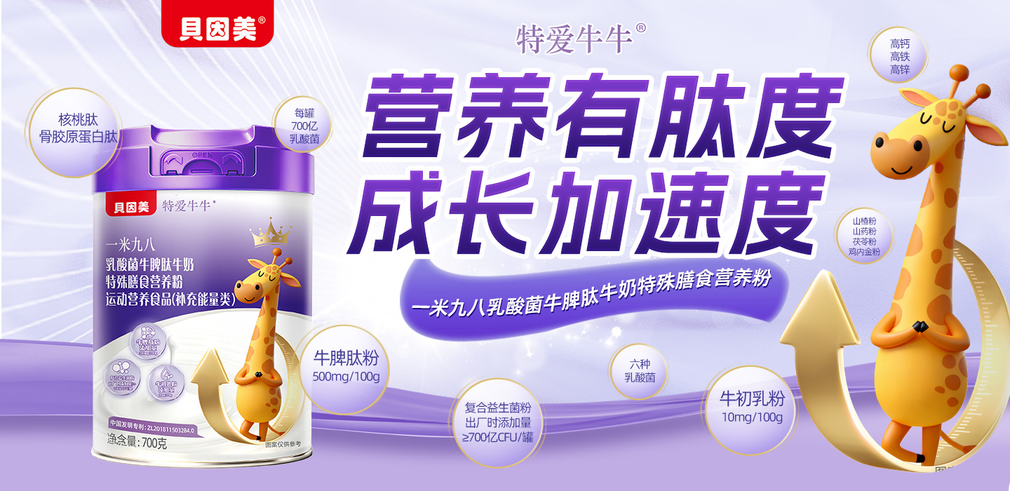 貝因美特愛牛牛一米九八乳酸菌牛脾肽牛奶特殊膳食營養(yǎng)粉,中國發(fā)明專利:ZL201811503284.0,安全放心!每100添加牛脾肽粉500mg,牛初乳粉10mg,復(fù)合益生菌粉出廠時添加量≥700億CFU/罐,科學(xué)配方,優(yōu)質(zhì)營養(yǎng)!專為3-15歲兒童骨骼生長黃金期設(shè)計,營養(yǎng)有肽度,成長加速度!