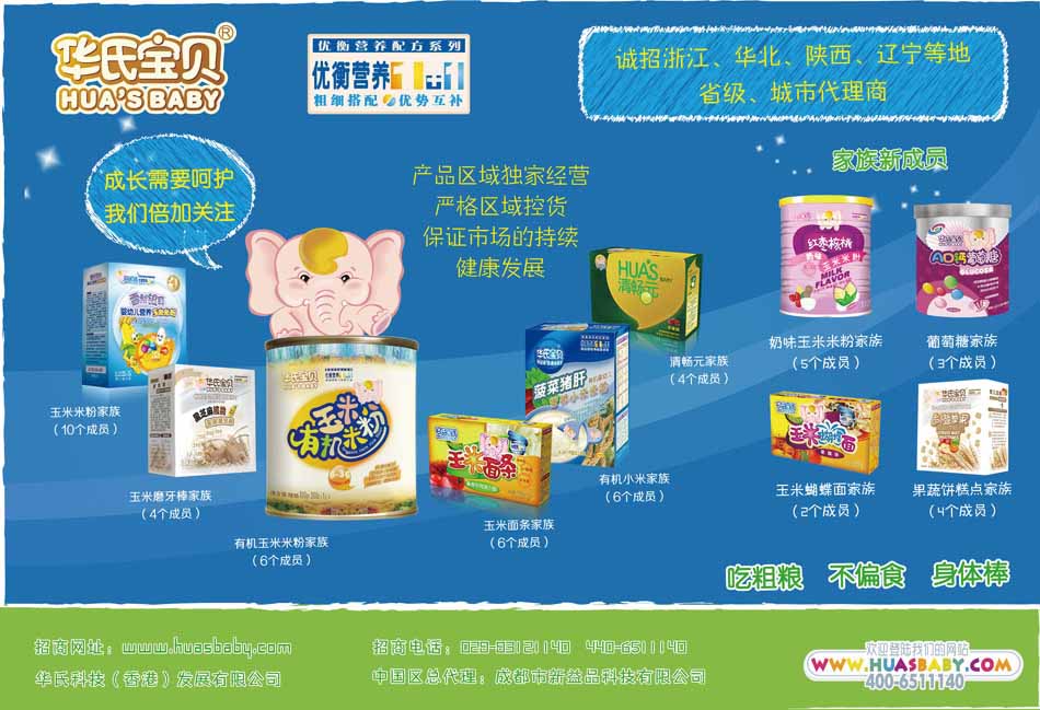 “華氏寶貝”是國內(nèi)較早提出“優(yōu)衡營(yíng)養(yǎng)1+1粗細(xì)搭配,優(yōu)勢(shì)互補(bǔ)”概念的嬰幼兒營(yíng)養(yǎng)輔食品牌。包括優(yōu)衡營(yíng)養(yǎng)嬰幼兒玉米米粉、有機(jī)小米米粉、有機(jī)玉米米粉、玉米面條、玉米磨牙棒以及集清火、解毒、健脾、護(hù)腸為一體的華氏寶貝清暢元。