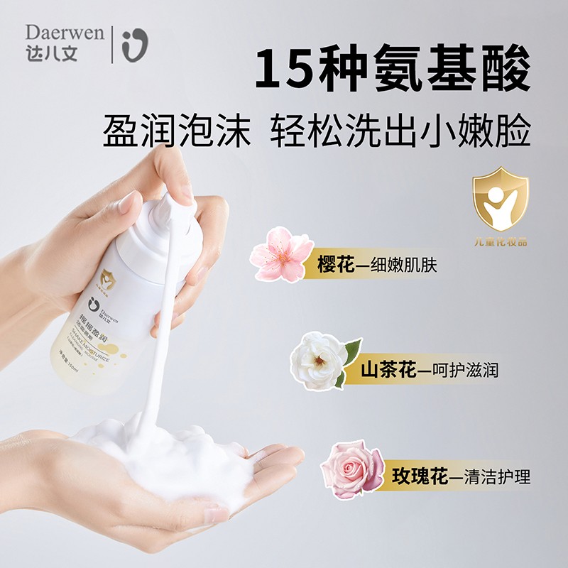 達(dá)兒文搖搖盈潤(rùn)潔面慕斯,15種氨基酸,盈潤(rùn)泡沫,洗出小嫩臉。櫻花細(xì)嫩肌膚,山茶花呵護(hù)滋潤(rùn),玫瑰花清潔護(hù)理。弱酸性配方,更接近皮膚pH值。