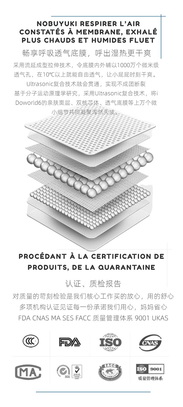 Ultrasonic復(fù)合技術(shù)融會貫通,實(shí)現(xiàn)不成團(tuán)斷裂;诜肿舆\(yùn)動原理學(xué)研究,采用Ultrasonic復(fù)合技術(shù),將iDoworld6的親膚面層、雙核芯體、透氣底膜等上萬個微小細(xì)節(jié)共同凝聚渾然夭成。