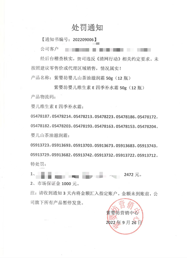 從實(shí)施以來,紫嬰坊已經(jīng)對(duì)數(shù)十起違反相關(guān)條約的責(zé)任人,做出警告、罰款及終止合作等處罰,針對(duì)不遵守規(guī)則、不顧及他人利益的代理商,紫嬰坊絕不手軟。一張張?zhí)幜P單就能看出紫嬰坊嚴(yán)打的決心。