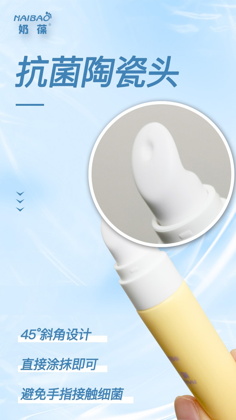 在設(shè)計(jì)上,奶葆嬰兒唇周膏也盡顯巧思。它配備了抗菌陶瓷頭,采用 45° 斜角設(shè)計(jì),使用時(shí)直接涂抹即可,有效避免了手指接觸帶來的細(xì)菌,讓家長們能放心給寶寶使用。