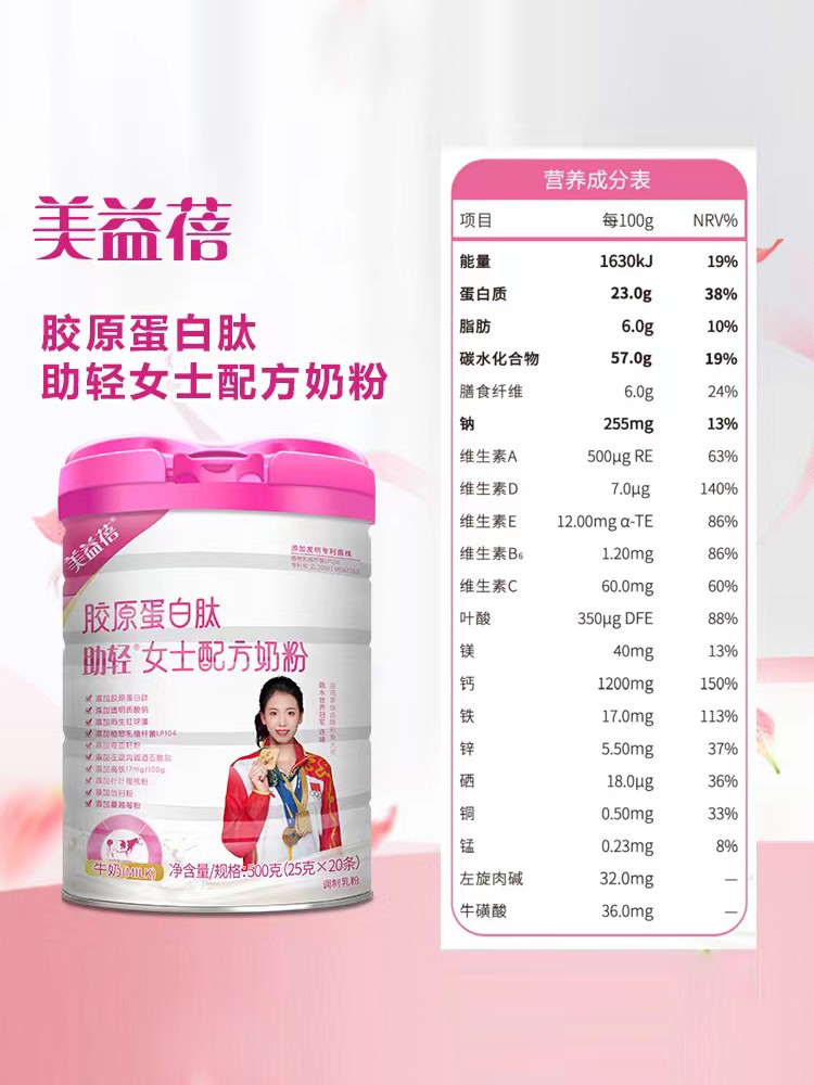 美益蓓膠原蛋白肽助輕女士配方奶粉以 “科學(xué)營(yíng)養(yǎng)” 為核心研發(fā)理念,針對(duì)女性群體的營(yíng)養(yǎng)需求精心調(diào)配。產(chǎn)品不僅添加 5 倍高鈣,還匯聚了膠原蛋白肽、透明質(zhì)酸鈉、雨生紅球藻等多種優(yōu)質(zhì)成分,同時(shí)融入針葉櫻桃粉、蔓越莓粉、當(dāng)歸粉、奇亞籽粉及左旋肉堿,形成多元且均衡的營(yíng)養(yǎng)組合,契合當(dāng)下女性對(duì)高品質(zhì)營(yíng)養(yǎng)產(chǎn)品的追求,為市場(chǎng)推廣奠定了堅(jiān)實(shí)基礎(chǔ)。